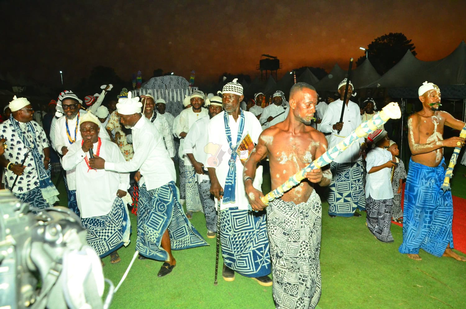 One of the most important insights from Ogbo Ekpe Amuvi was the visible participation of women within the Ekpe institution. Women have defined roles, authority, and moments of visibility. They also had their time in the arena, a fact corroborated through interviews with the Iyamba women, the female contemporary of the Ekpe institution. This challenges simplistic narratives and reinforces Ekpe as a complex and inclusive social system. The highpoint of the event was the entry of the Ekpe Arochukwu, heralded by the Iyamba women, whose colourful attire, swirling handkerchiefs, and graceful yet powerful dance steps captivated the audience. Behind the Iyamba women marched members of the Ekpe institution in Arochukwu, wrapped in the iconic indigo Ukara Ekpe cloth—a potent symbol of identity and authority—advancing into the arena in a solemn, distinctive procession that commanded reverence.